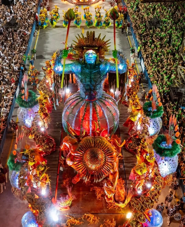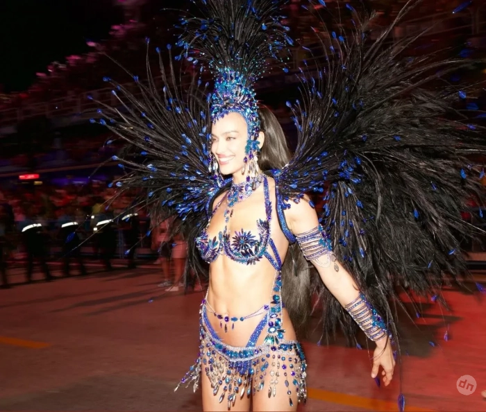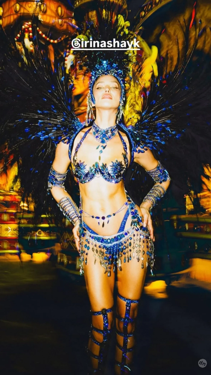 Перед карнавалом Ирина Шейк подогрела внимание подписчиков к мероприятию, опубликовав фото в обнажённом виде и в украшениях синего цвета. Прошлой ночью Ирина прошлась по улицам бразильского города в блестящем бикини этого же цвета и головном уборе с перьями.