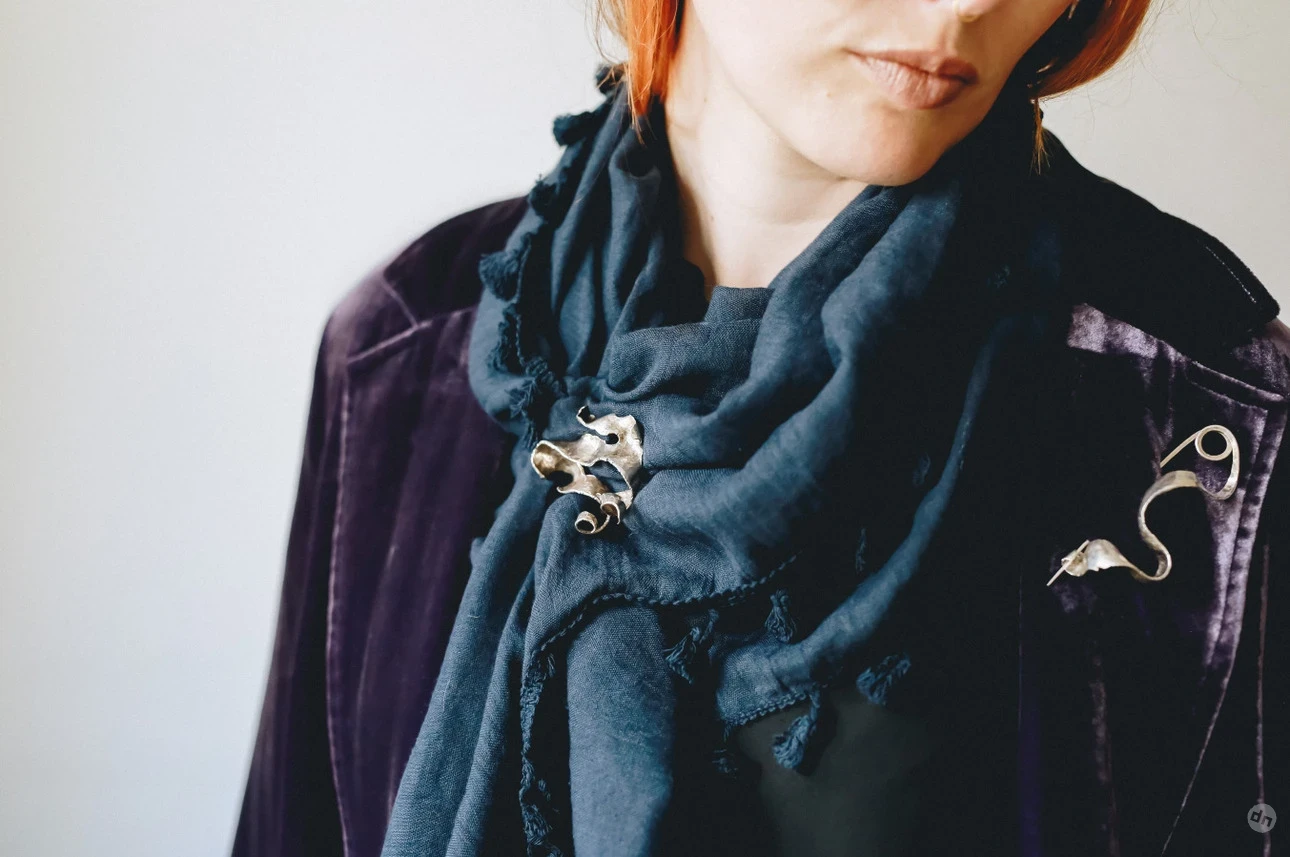 Зимой брошь отлично заменяет украшения, которые не видно под слоями одежды. Ее можно закрепить на свитере, кардигане, шарфе или на шерстяной косынке. Важно учитывать вес — брошь не должна деформировать ткань. Зато даже самый простой трикотаж с ней выглядит продуманно и стильно.