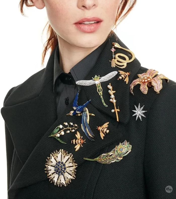 Один из самых модных приемов — носить сразу две или три броши. «Их можно объединять по теме (цветы, геометрия, символы) или, наоборот, играть на контрасте. Такой прием хорошо работает на плотных тканях: твид, шерсть, кашемир. Образ сразу перестает быть заурядным и становится очень актуальным», — утверждает стилист.