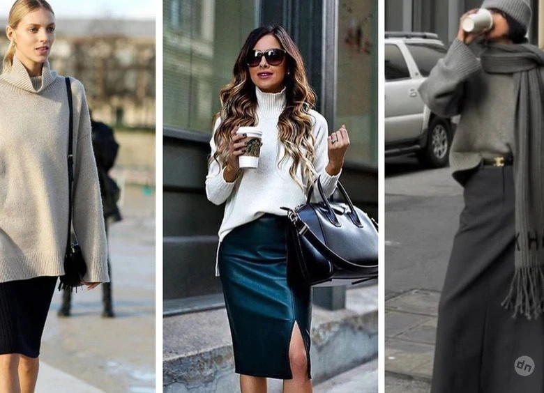 Лучшие компаньоны для юбки-карандаш зимой — объемные свитеры, тонкие кашемировые водолазки, мягкие кардиганы и структурированные жакеты. Контраст объемов работает на стиль, узкий низ и расслабленный верх делают образ современным и неформальным. Важно не заправлять верх за пояс целиком, легкая асимметрия или частичная (например, французская) заправка смотрятся гораздо актуальнее.
