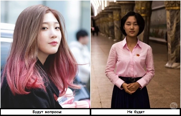 • Стрижка и покраска. В КНДР существует регламентированный список стрижек. Женские включают 18 пунктов, мужские – еще меньше. Выбирать можно только из них, иначе возникнут вопросы. Что касается покраски, то она здесь запрещена. Единственное, что вы можете сделать – замаскировать седину черной краской. Наверное, именно поэтому все кореянки так похожи друг на друга – одинаковые стрижки и цвет волос не способствуют проявлению индивидуальности.
