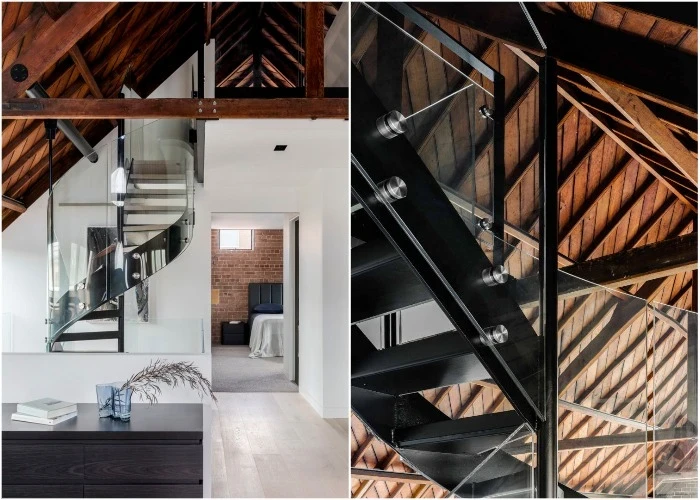 Новое архитектурное решение сочетает традиции с современным дизайном благодаря тщательному подбору материалов, освещения и пространственной организации. Деревянную крышу, например, реконструировали, полностью была сохранена открытая деревянная стропильная конструкция и даже кирпичная кладка внутри помещений. Для увеличения жилого пространства было принято решение разделить часть здания на два уровня, благо значительная высота позволяла это сделать.