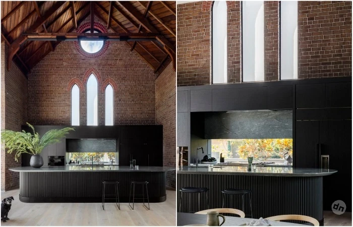 Напоминая о церковном алтаре, укрепляя связь между прошлым и настоящим в центре основного жилого помещения, обустроена просторная и современная кухня. Вместительный мебельный гарнитур с черными матовыми фасадами органично сочетаются с кирпичной кладкой. А вот огромный остров с его закругленными углами и стратегическим расположением подчеркивает сочетание функциональности и эстетики. Он выступает и в роли просторной рабочей зоны, обеденного стола и барной стойки, все зависит от потребностей владельцев.