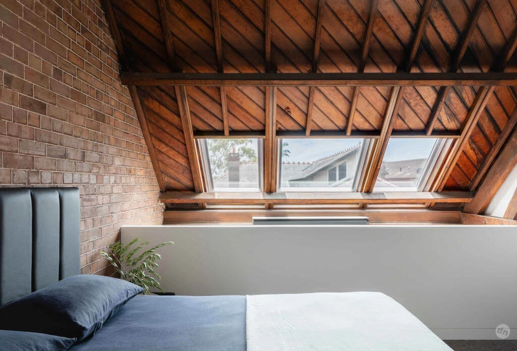 Главная спальня на лофте The Church Residence. | Фото: michiruhigginbotham.com.au.