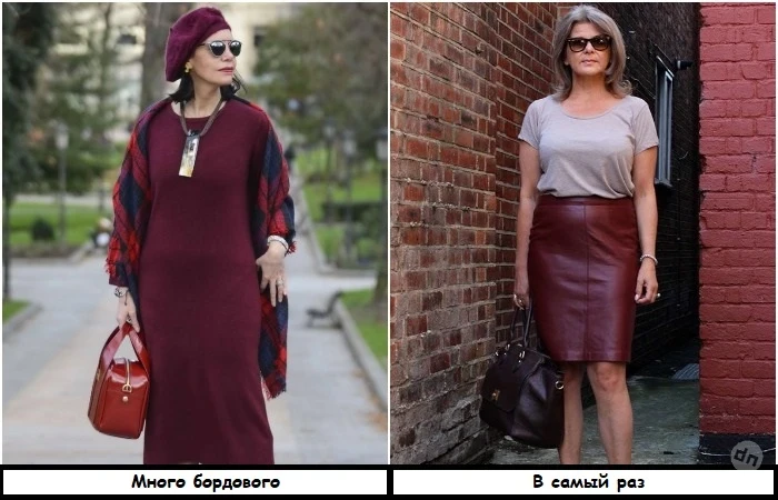 Благородный и элегантный цвет невероятно популярный в этом сезоне. Он даже потеснил трендовый шоколадный в гардеробах модниц. Однако с бордовым всегда нужно быть начеку. Несмотря на всю красоту и стиль, он беспощадно подчеркивает покраснения на лице и мешки под глазами – те проблемы, которые часто присутствуют у женщин после 50 лет. Поэтому собрать аутфит в стиле тотал-бордовый – не самая лучшая идея. Лучше миксовать его с вещами базового оттенка, например, молочными или бежевыми, особенно в зоне лица. Также стилисты советуют обратить внимание на комбинации с нежно-голубым – этот цвет смягчает негативный эффект бордового и помогает создать гармоничный образ.