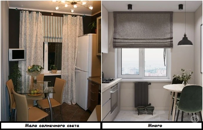 Чем больше света попадает на кухню, тем больше она кажется. Увы, маленькие кухни часто могут похвастаться только одним окном, которое выходит на северную сторону. Если это ваш случай, рекомендуем отказаться от плотных штор в пользу римских, которые в любой момент можно приподнять. Так вы сможете впустить на кухню максимальное количество солнечных лучей. Еще один вариант – полупрозрачные занавески, закрепленные под самым потолком, выше рамы. Этот прием поможет создать иллюзию высокого потолка, что особенно актуально в хрущевках.