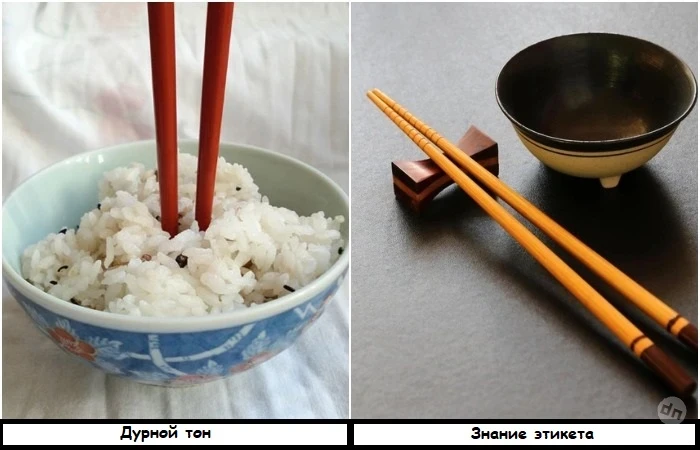 Японцы никогда не вставляют палочки в еду – это считается дурным знаком. Обычно их кладут на специальную поставку, которую подают вместе с тарелками и прочей посудой. При выборе еды не указывайте на нее палочками. Для вас это удобно, а для жителей Японии – оскорбительно.