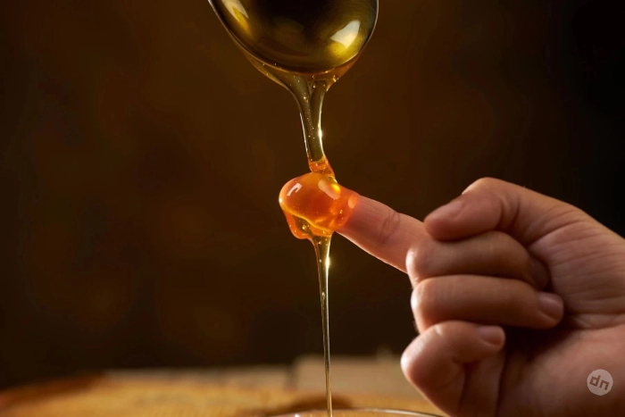 Медовая капелька аккуратно наносится на тыльную сторону ладони, а затем осторожно переворачивают руку вниз. Зрелый, добротный продукт держит форму (как правило, он не будет растекаться мгновенно и не «убедит» от тепла кожи). Его плотность позволяет капле сохранять очертания. После этого мёд слегка растирают в течение минуты. Натуральный постепенно впитывается, кожа становится мягкой, без выраженной липкости. Если же масса остаётся тягучей плёнкой и заметно липнет это может указывать на добавление сиропа или избыточную влагу.