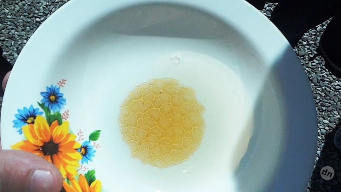 На плоскую тарелочку выкладывают пару ложечек продукта, затем поверх аккуратно капают немного прохладной воды и слегка вращают тарелку круговыми движениями. Иногда на поверхности появляется рисунок, который так похож на соты. Сторонники метода считают это признаком натуральности. Однако с точки зрения физики подобный узор может образовываться и у других вязких жидкостей при разнице температур и движении. Поэтому такой способ нельзя считать надёжным доказательством качества (он скорее демонстрирует свойства плотной среды, чем подтверждает происхождение продукта).