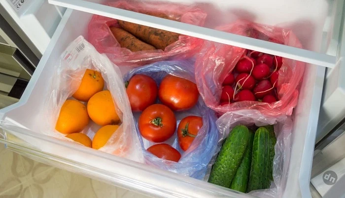 Овощи вместе с фруктами лежат в холодильнике. / Фото: sovkusom.ru