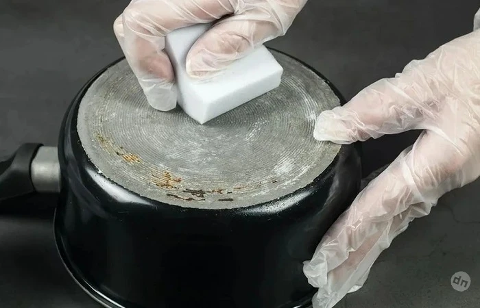 Идея заменить обычную кухонную губку на меламиновую кажется удобной, но для посуды это плохое решение. Антипригарное покрытие рассчитано на бережный уход, а «абразивная» губка, даже во влажном виде, способна оставить заметные следы, повреждая защитный слой, делая его шероховатым, тем самым сокращая срок службы сковороды или кастрюли. Кроме того, при трении, мелкие частицы могут оставаться в микротрещинах покрытия. При последующем нагревании они могут оказать пагубное влияние на организм, так как не предназначены для контакта с пищей. Допустимо использовать такую губку только для мытья внешней стороны посуды – дно и стенки снаружи, где скапливается нагар. Внутреннюю часть, особенно со специальным защитным слоем и покрытием, лучше мыть мягкой губкой и средством, рекомендованным производителем.