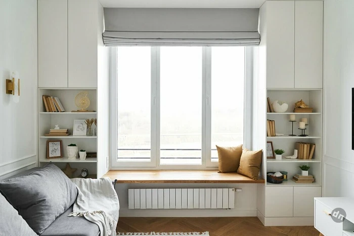 Еще один вариант того, как по максимуму задействовать пространство в маленькой квартире, – сделать по бокам от оконного проема стеллажи, а подоконник превратить в полку. Это отличное решение, если в доме есть много книг, декора и полезных мелочей, которые негде разместить. Чтобы избежать визуального шума, предусмотрите для вещей красивые корзинки, коробки, органайзеры и пр.