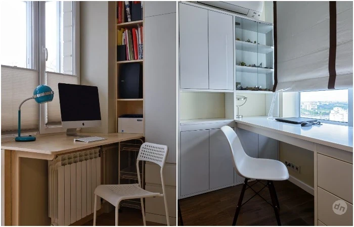 Работаете из дома на удаленной основе? Тогда вопрос обустройства мини-кабинета стоит особенно остро. Если нет возможности установить отдельный письменный стол или спрятаться от членов семьи на застекленном балконе, используйте подоконник. Важно, чтобы он подходил под ваши запросы по высоте и ширине. Все в порядке? Тогда просто установите на новом «рабочем столе» ноутбук и решайте поставленные задачи. Для удобства можете дополнить зону полками и ящиками, где будет удобно хранить книги, папки, документы, канцелярию и пр.
