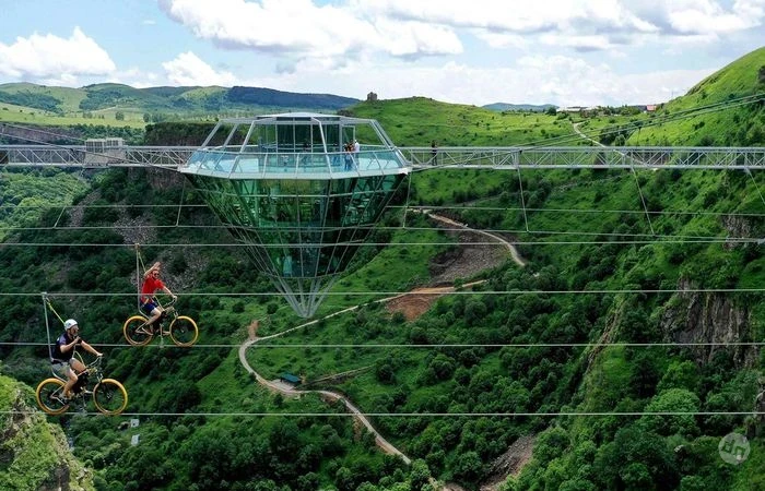 Всего в сотне километров от Тбилиси, над Цалкским каньоном, появился один из самых необычных мостов Европы. Его посторожили в экокомплексе Цалка, и с воздуха конструкция в самом деле напоминает гигантский бриллиант, длинной в двести сорок метров. Под стеклянным настилом виднеются сотни метров пустоты и отвесные скалы каньона, которые так и манят величественной красотой. В центре моста есть небольшое кафе с одноимённым названием «Бриллиант 360». Заведение буквально висит над пропастью и считается одним из самых высоко расположенных подвесных cafe-bar в мире. Здесь действует dress code бизнес-кэжуал – тот редкий случай, когда деловой стиль сочетается с видом на каньон глубиной более километра.