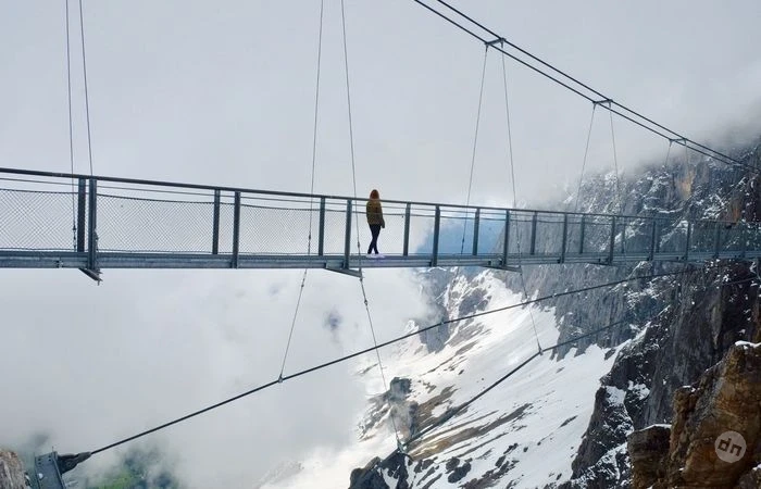 На высоте около трёх тысяч метров в Австралийских Альпах есть довольно-таки интересный аттракцион с необычным названием «Лестница в никуда». Сначала посетителей ждёт подвесной мост длинной примерно сто метров. Он тянется над пропастью и при сильном ветре заметно покачивается, напоминая, что природа вокруг настоящая, а не декорации. За мостом начинается стеклянная площадка, выступающая примерно на четырнадцать метров за край скалы. Сделать несколько шагов по прозрачному полу – уже достаточный повод вспомнить о высоте.