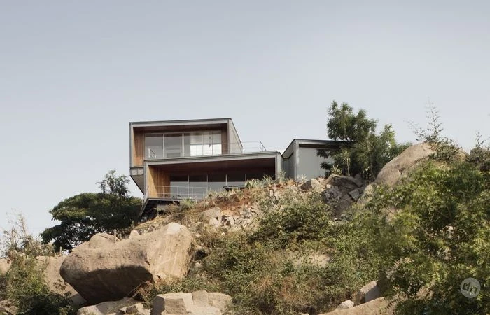 Этот дом на берегу озера Дургам Черуву рядом с Хайдарабадом сразу привлекает внимание своей геометрией. Несколько строгих блоков, поставленных друг на друга, образуют выразительную композицию, которая контрастирует с неровной линией скал. Конструкция выполнена из стали и облицована местным гранитом. За счёт этого здание выглядит основательным, почти монолитным, но большие панорамные окна во всю высоту стен добавляют лёгкости и открытости. Дом буквально нависает над водой, и изнутри кажется, будто озеро становится частью интерьера. Пространство организовано так, чтобы максимально использовать вид. Жилые зоны ориентированы на воду, а террасы позволяют находиться на границе между домом и природой. В разное время дня фасады по-разному реагирует на свет, и строгая архитектура начинает постепенно оживать, отражая небо, воду и живописный ландшафт.