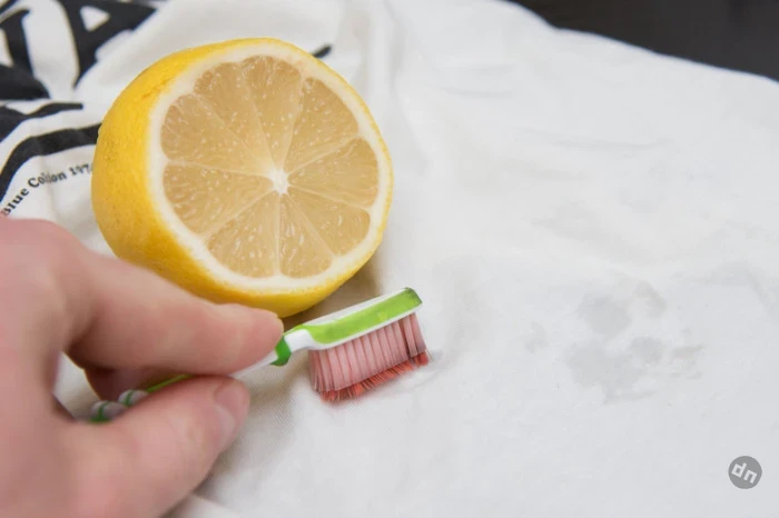 Если перекиси водорода в аптечке не оказалось, используйте для чистки светлых вещей лимонный сок. Он также обладает отбеливающими свойствами и может быстро привести одежду в порядок. Смочите загрязненный участок водой, выдавите несколько капель лимонного сока и оставьте на полчаса (вместо лимона можно использовать разведенную в воде лимонную кислоту). Оставьте средство на полчаса, чтобы оно подействовало, а затем хорошо промойте ткань под теплой водой и отправьте в стиральную машину.