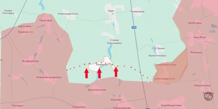 Российские войска провели успешные штурмовые действия к западу от ранее освобождённого пгт Новгородское (Нью-Йорк) в ДНР. В результате стремительного штурма под контроль ВС РФ перешла значительная часть населённого пункта Калиново. Он находится севернее транспортного узла Очеретино (под контролем армии России) и западнее дороги Н20, которая ведёт из Донецка в Константиновку.