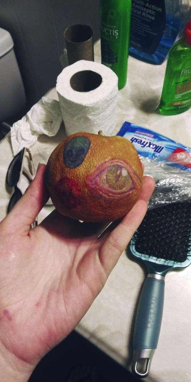 Апельсин, на котором я много лет назад практиковался в нанесении своих первых татуировок. Я положил его на полку и забыл о нём. Теперь он высох, но при этом сохранил на себе все рисунки. Он практически ничего не весит и тверд, как скала.