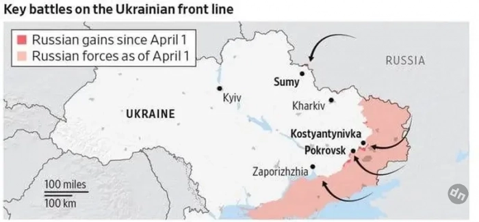 Американская газета приводит, как они считают, наиболее существенные для ВСУ, проблемы на фронте, подтверждающие решимость Москвы продолжать наступление и неспособность Киева ему противостоять. Так, город Константиновка фактически окружен. Аналогичная перспектива ждет и Покровск (Красноармейск). В Сумской области более 50 тысяч российских солдат вошли с севера, создавая плацдарм у границы. Могут пойти и вглубь, как заявила нардеп ВРУ Безуглая, — сразу на Киев.
