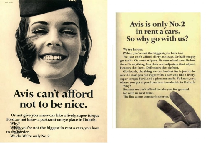 В 1963 году компания Avis, занимавшая второе место на рынке автомобильных прокатов, запустила революционную кампанию «We Try Harder», разработанную агентством Doyle Dane Bernbach. Кампания, основанная на честности и признании своего второго места, значительно улучшила имидж Avis и повысила их продажи.