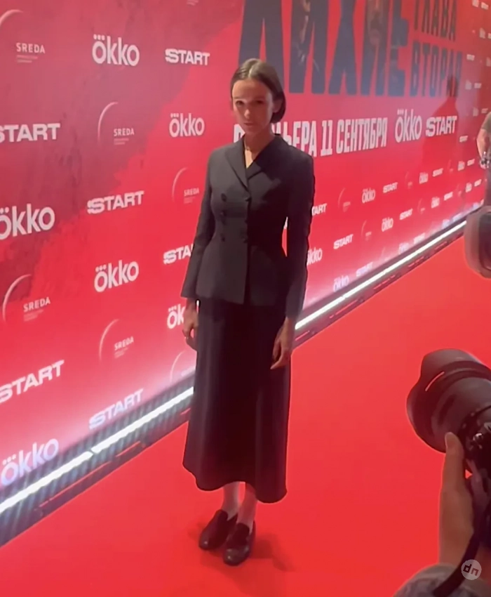 36-летняя актриса и бывшая жена Фёдора Бондарчука позировала на дорожке в чёрном приталенном жакете, юбке-миди и лоферах.
