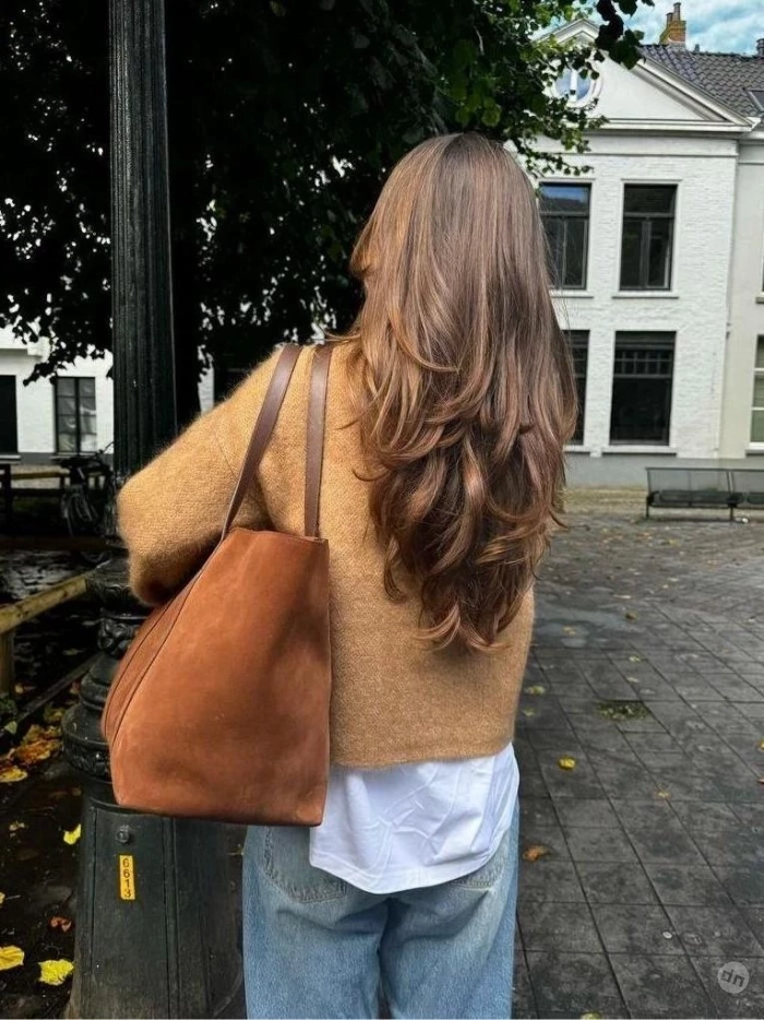 Если кашемировый блонд ассоциируется с легкостью и сиянием, то теплый шатен — с глубиной и устойчивостью. Этот цвет сочетает шоколадные, ореховые и золотистые полутона, делая волосы визуально плотнее и более выразительными.
