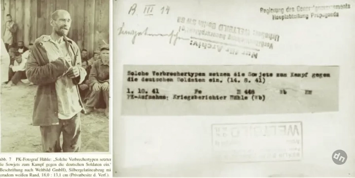 Фото роты пропаганды. Подпись гласит: «Вот таких преступников Советы применяют в бою против немецких солдат». Справа также сопроводительный ярлык на обороте снимка. Присутствуют две даты: дата съёмки и дата выпуска для прессы. И, как обычно, сопутствующий пропагандистский текст. Изображенный человек очень беден и одет в лохмотья, что может вызвать жалость у публики. Для предотвращения этого человек называется преступником.