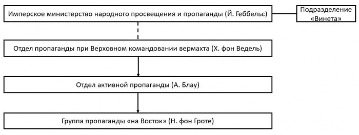В начале данный отдел состоял преимущественно из людей, покинувших Российскую империю в период дореволюционной эмиграции. Но в дальнейшем их пришлось заменить в связи с их непониманием политических настроений советских людей. «Винета» состояла из нескольких национальных секций: украинской, эстонской, латышской, белорусской и русской. Русская секция была самой крупной, в ней состояли примерно 800 человек. Секцию возглавлял А. П. Альбов, из старых эмигрантов, георгиевский кавалер. Во главе всей организации стоял доктор философии Ханс Хумпт. Соединяя эту информацию с информацией из прошлой статьи («Структура фронтовой пропаганды нацистской Германии»), становится возможно создать общую схему.