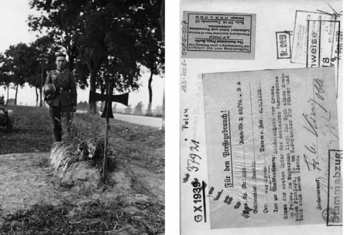 Фото слева – это сделанный ротой пропаганды снимок, а фото справа – это сопроводительный ярлык на его обратной стороне. Описание гласит: «Солдатская могила у Кроне (г. Валч в Польше). Одна из первых жертв во время немецкого продвижения в Польшу. Солдатская могила на обочине принадлежит сапёру, 2 сентября отдавшему свою жизнь за фюрера и за свой народ».