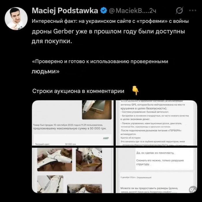 Пользователи польского сегмента соцсетей резонно отмечают, что дроны-«обманки» «Гербера» массово продаются на украинском «черном» рынке. Таким образом, вопреки воинственным заявлениям некоторых польских политиков, «российский след» в недавнем нарушении воздушного пространства Польши становится все более зыбким.