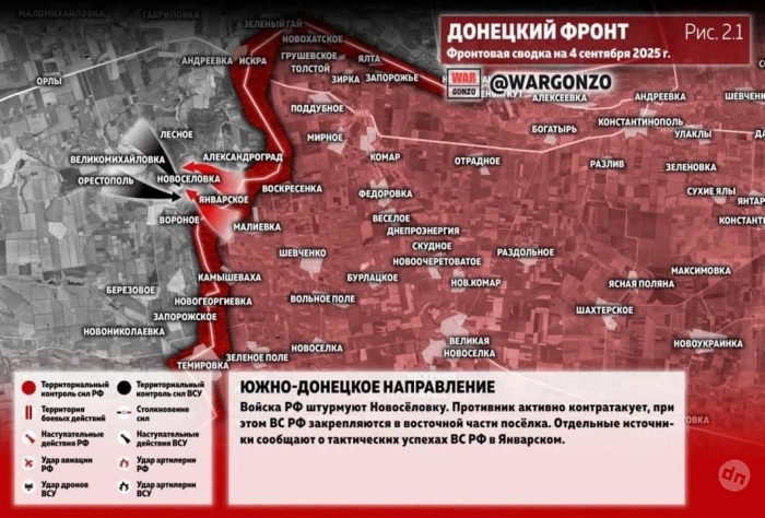 На Южно-Донецком направлении войска РФ штурмуют Новосёловку. Противник активно контратакует, при этом ВС РФ закрепляются в восточной части посёлка. Отдельные источники сообщают о тактических успехах ВС РФ в Январском.