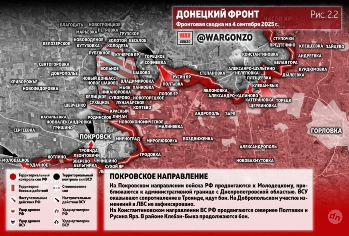 На Покровском направлении войска РФ продвигаются к Молодецкому, приближаются к административной границе с Днепропетровской областью. ВСУ оказывают сопротивление в Троянде, идут бои. На Добропольском участке изменений в ЛБС не зафиксировано.