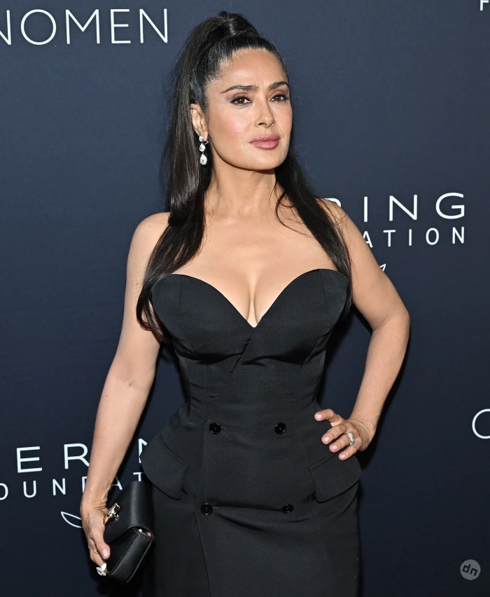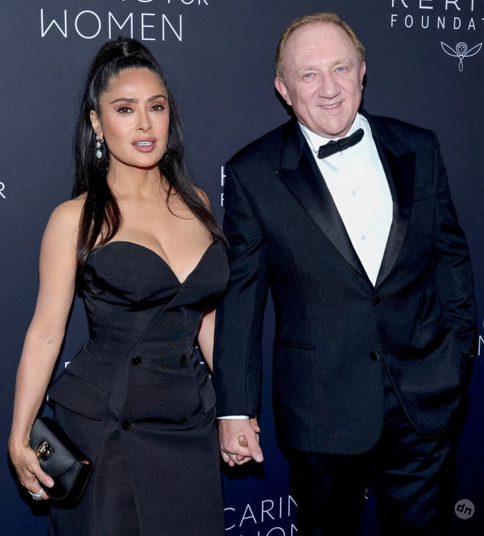 59-летняя актриса и супруга генерального директора Kering Франсуа-Анри Пино Сальма Хайек пришла на мероприятие в чёрном платье Balenciaga из костюмной ткани. Она дополнила образ серьгами с бриллиантами, клатчем Gucci и причёской с высоким хвостом.