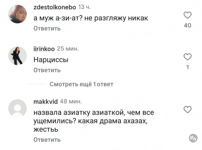 Скриншот из инстаграма*Из-за случившегося многие начали обвинять Сюзанну в расизме, а её соцсети наводнили комментарии от представителей стран Азии: “Всем привет с Алматы”, “А муж а-зи-ат? Не разгляжу никак”.