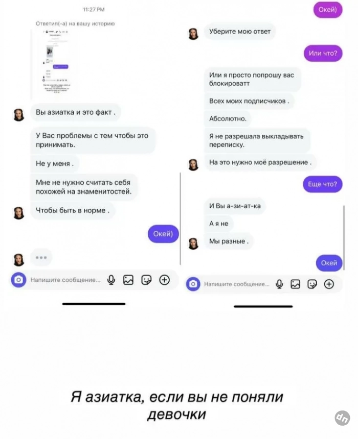Сюзанна ВарнинаСкриншот из инстаграма*В итоге поклонница артистки показала скриншот её сообщений в сторис*, с припиской: “Она мне нравилась годами, ровно до этого момента. Ясен пень, что не близняшки, но акцентировать на “азиатка”. Втф”. Сюзанна после этого предположила, что у девушки, вероятно, проблемы с тем, чтобы принимать правду о себе, и вновь подчеркнула, что та является “а-зи-ат-кой”. Также она потребовала удалить сторис*: “Или я просто попрошу вас блокировать. Всех моих подписчиков, абсолютно”.