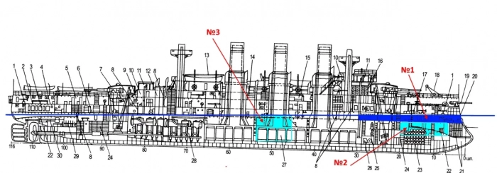 1. Открыл доступ воде не только в 1-ый, но и во 2-ой отсек, так как его разрыв повредил водонепроницаемую переборку между ними. В результате данного попадания жилая палуба от 0-го до 30-го шпангоута, то есть на протяжении более чем 30 м, превратилась в эдакий «совок», направленный в сторону хода корабля и «загребающий» воду через пробоину.