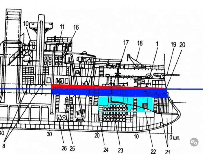 В этом случае принятая на жилую палубу вода создала бы усилие, равное 137 * 670,6 = 91 851 тонно-фут (поскольку я считаю с большим количеством знаков после запятой, но не пишу этих знаков в статье, калькулятор покажет чуть иную цифру), и вызовет дифферент на нос почти в 80,4 дюйма или же на 204,2 см. Соответственно, форштевень «Осляби» погрузился бы на 204,2+32,6 = 236,8 см, так и не достигнув уровня батарейной палубы, возвышавшейся над жилой палубой на 243,8 см. Вполне очевидно, что при этом известная часть 1-го и 2-го отсеков жилой палубы осталась бы над водой (на схеме выделено красным)