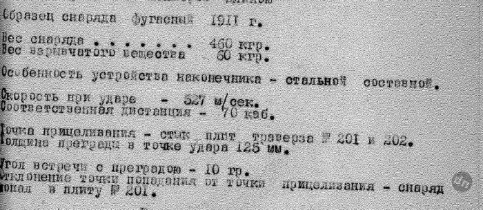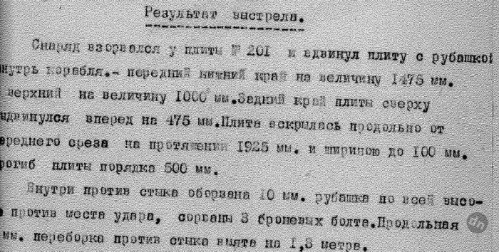 В качестве примера подобного воздействия рассмотрим выстрел № 41 по «исключенному судну» «Чесма», выполненному в ходе испытаний новейших на тот момент 12-дм снарядов обр. 1911 г. Выстрел был сделан по 125-мм бронеплите, аналогичной той, что защищала траверз линкоров типа «Севастополь». Стреляли фугасным снарядом