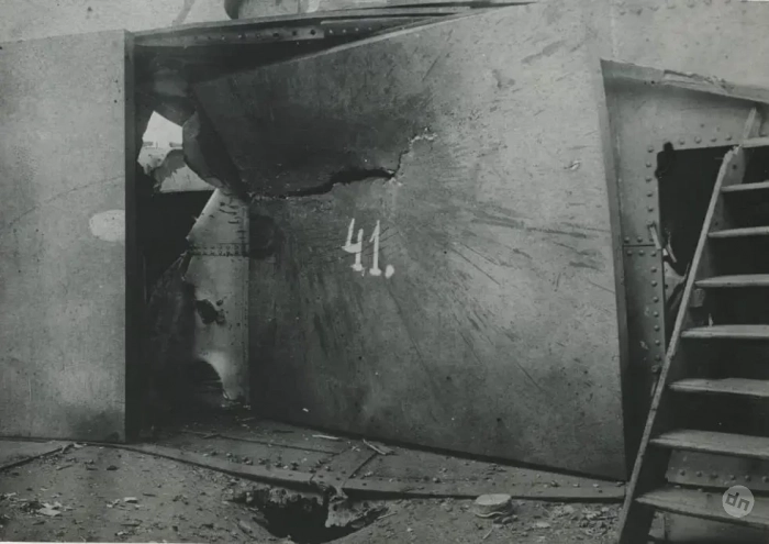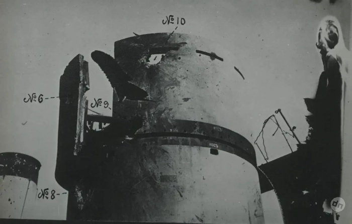 В результате попадания бронеплита оказалась вбита внутрь отсека и развернута вдоль своей оси, причем один ее край оказался направлен внутрь отсека, второй же торчал наружу.