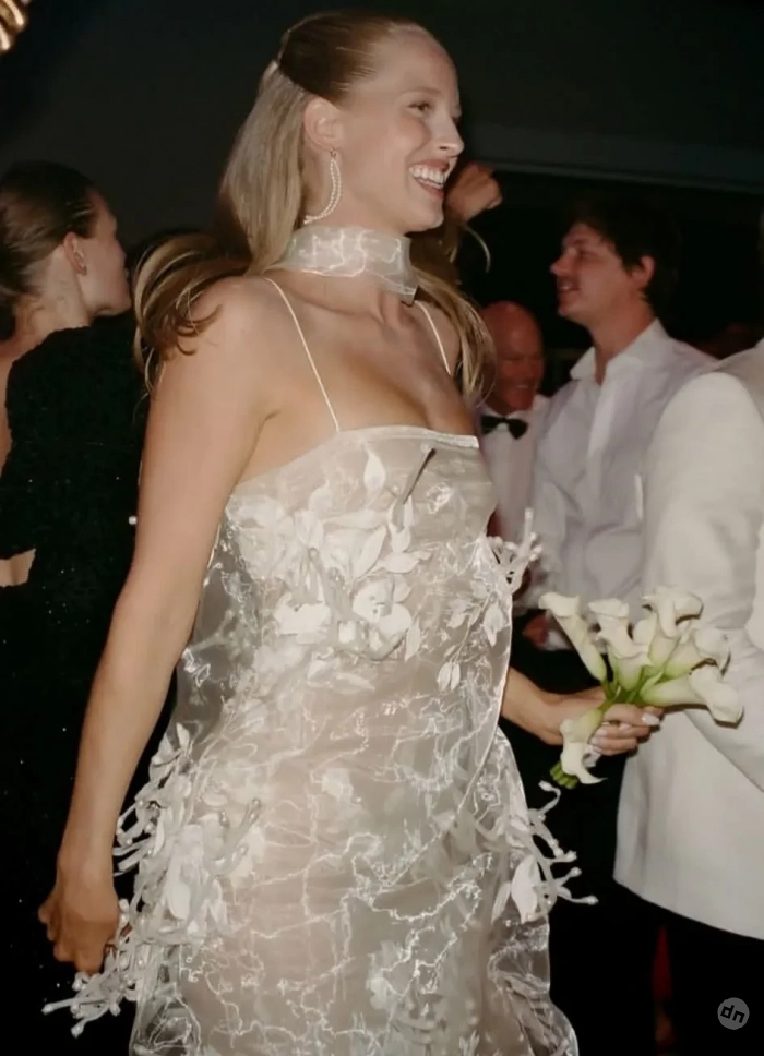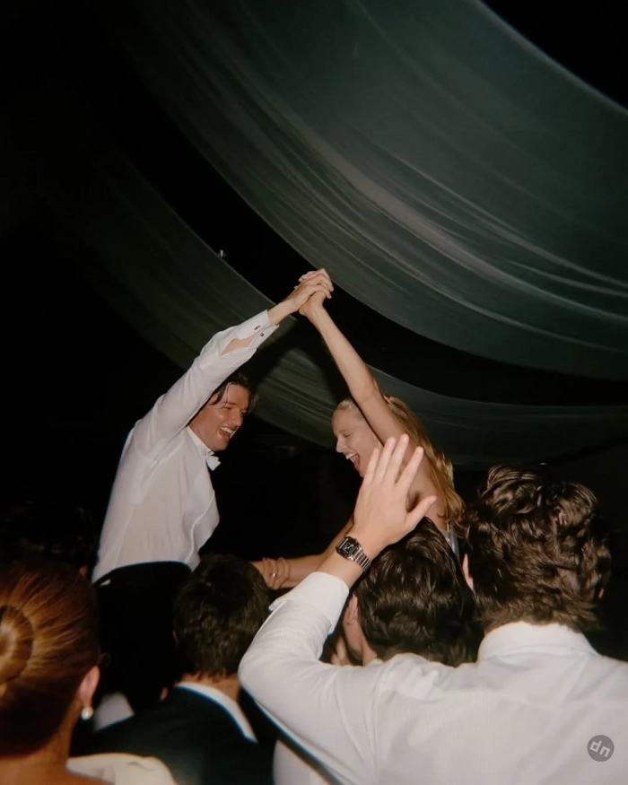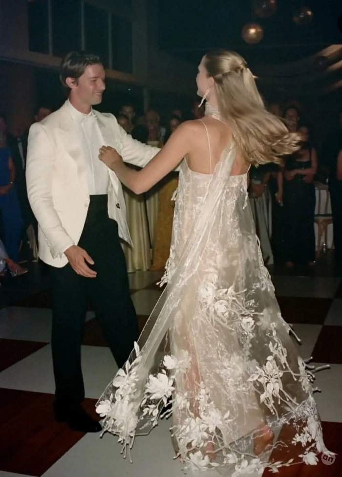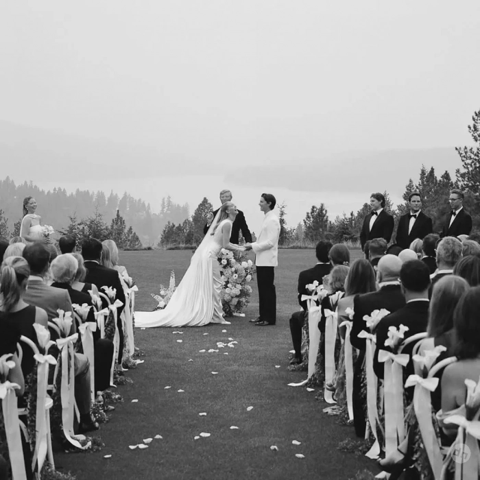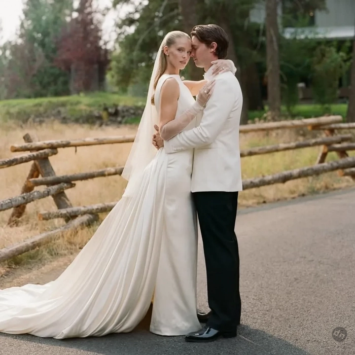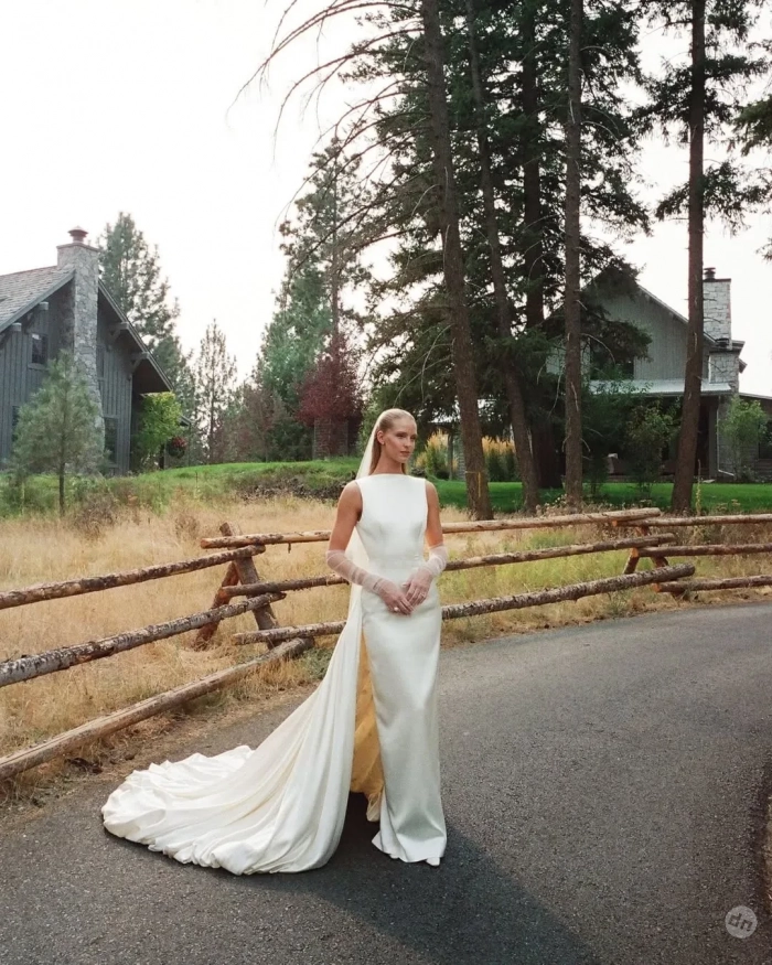 Торжество было организовано в городке Кёр-д’Ален в Айдахо и продолжалось три дня, так что невеста успела продемонстрировать несколько нарядов. На репетиционный ужин она надела платье Zimmerman с длинными рукавами, асимметричным подолом и отделкой, напоминающей лепестки цветов. А на приветственное барбекю в стиле вестерн — кружевное платье Bec + Bridge, чёрные ковбойские сапоги и чёрную шляпу.