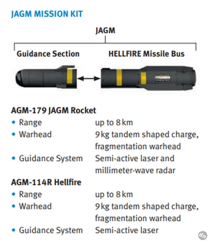 JAGM – это многосенсорная ракета, способная поражать как наземные, так и воздушные цели. Дальность полёта УР составляет до 16 км, она оснащена тандемной кумулятивно-осколочной БЧ. Многорежимная головка самонаведения JAGM оборудована усовершенствованным полуактивным лазерным датчиком (SAL) для точности огня и радаром миллиметрового диапазона (MMW) с функцией «выстрелил и забыл» для уничтожения движущихся целей в любых погодных условиях.