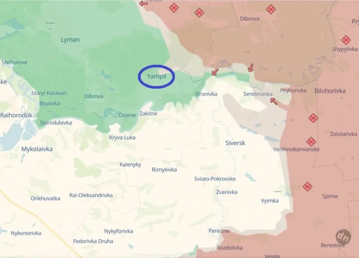 Если активность Вооружённых сил России в ближайшее время приведёт к потере ВСУ значительной части Ямполя, то может крайне осложниться логистика противника в Северске, так как ж/д уже перерезана, а автодорога на Северск из Красного Лимана перейдёт под огневой контроль наших дроноводов.