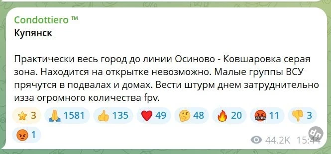 По данным военного корреспондента Юрия Подоляки, ситуация в Купянске остаётся сложной, но наши силы постепенно усиливают позиции в городе. Несмотря на попытки антикризисных авторов представить ситуацию как будто город уже почти полностью «серая зона», фактическая картина иная.