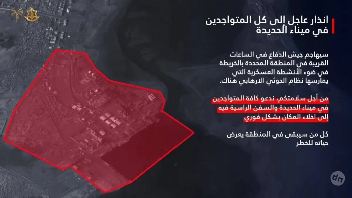 Израильская армия официально призвала к немедленной эвакуации гражданского персонала из порта Ходейда в Йемене. Предупреждение распространил представитель ЦАХАЛ Авихай Эдри через свою официальную страницу в социальной сети.