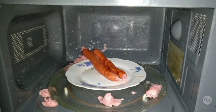 К этой категории относятся сосиски, сардельки, помидоры и другие продукты с кожурой. При нагреве оболочка лопается, и происходит «мини-взрыв». Это не только грязно, но и небезопасно.