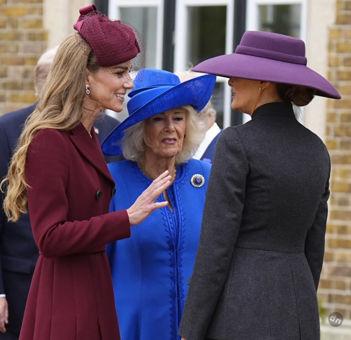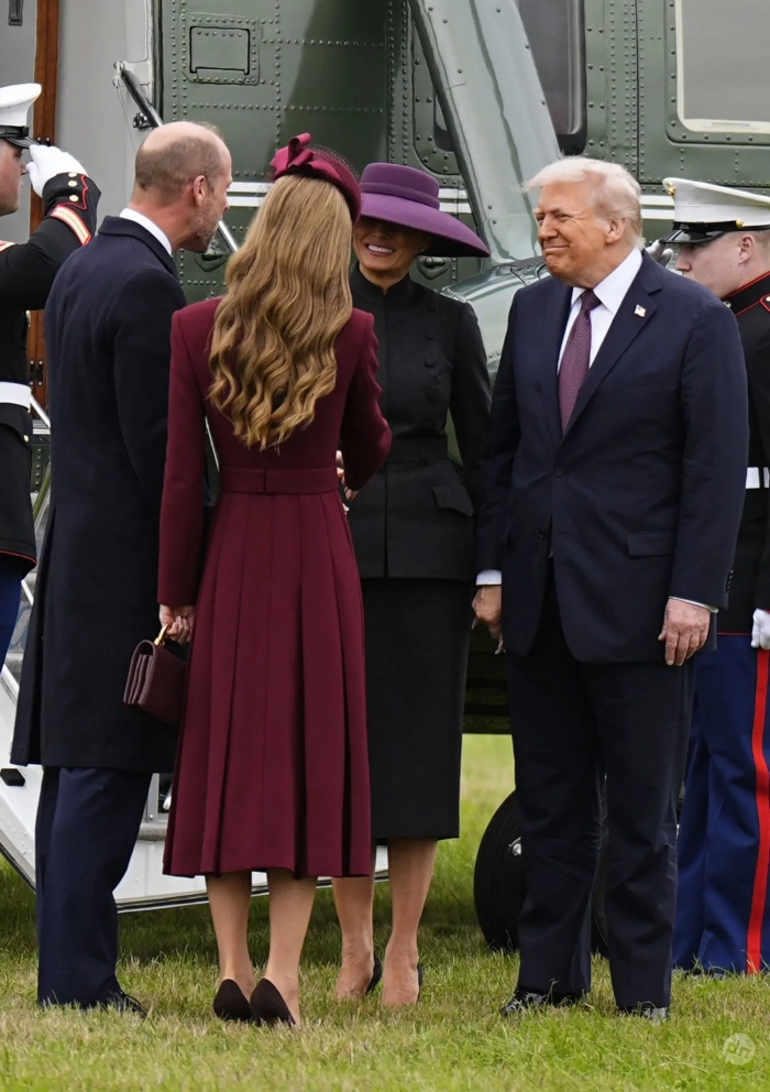 43-летняя Кейт Миддлтон надела на приём бордовое платье Emilia Wickstead и шляпу Jane Taylor в тон, а 55-летняя Мелания Трамп появилась перед королевской семьёй в чёрном приталенном жакете с юбкой-карандаш от Dior и дополнила образ фиолетовой шляпой.