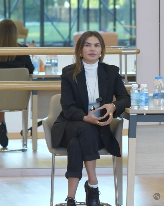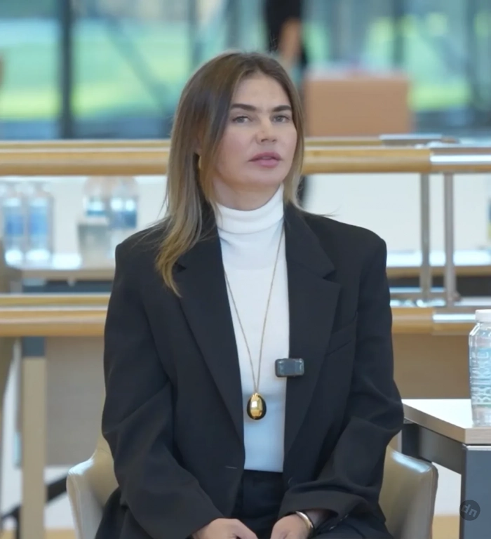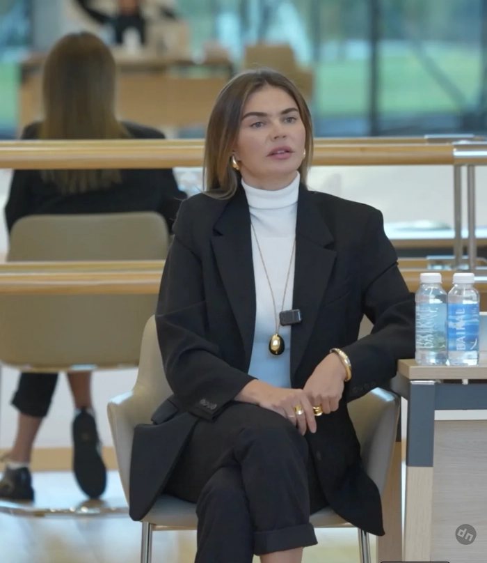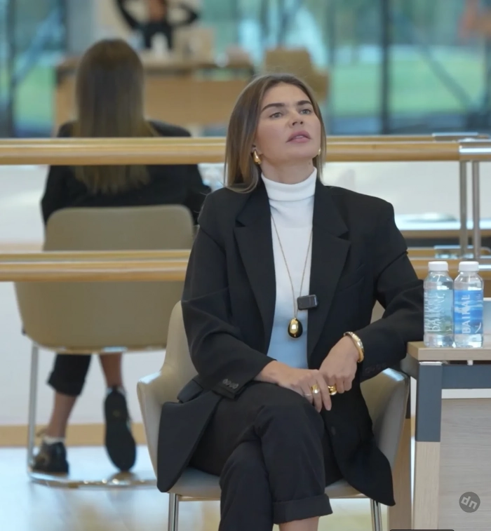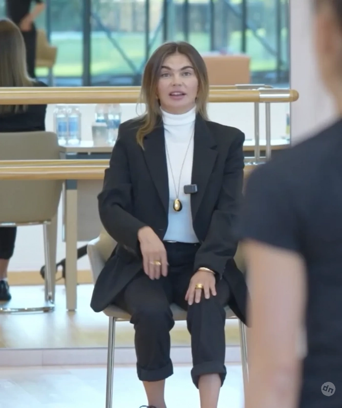 Вчера Алина появилась в зале в чёрном брючном костюме, белой водолазке и ботинках, дополнив образ золотыми украшениями: массивной подвеской, серьгами, браслетом и кольцами.