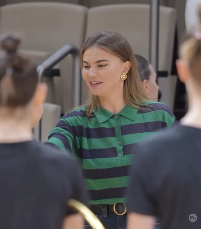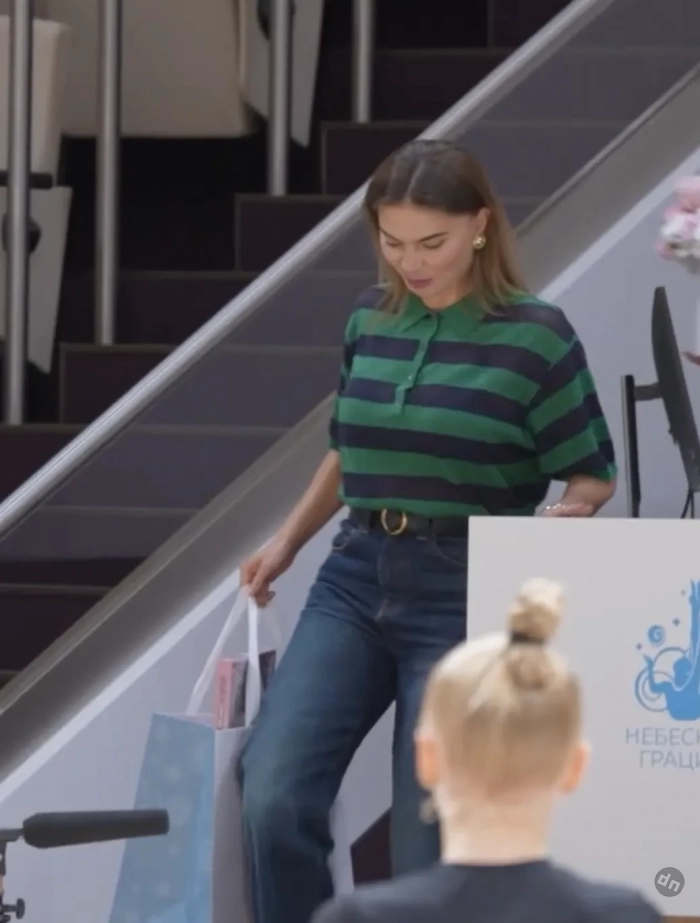 Алина КабаеваАлина КабаеваАлина КабаеваАлина КабаеваАлина КабаеваАлина КабаеваНакануне Кабаева пришла на контрольную тренировку гимнасток в более повседневном образе. Она надела футболку поло в зелёную полоску и синие джинсы. Свой второй образ чемпионка дополнила круглыми золотыми серьгами, а перед занятиями поздравила с днём рождения одну из воспитанниц.