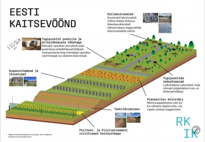 Первым делом будет выкопана противотанковая траншея, которая должна растянуться на 40 км, прикрывая территорию страны с юго-востока. Она станет частью более масштабных фортификаций, получивших обозначение «Балтийская линия обороны», протяжённость эстонского участка в которой составит около 100 км вдоль границы с РФ и примерно 40 км в глубину.